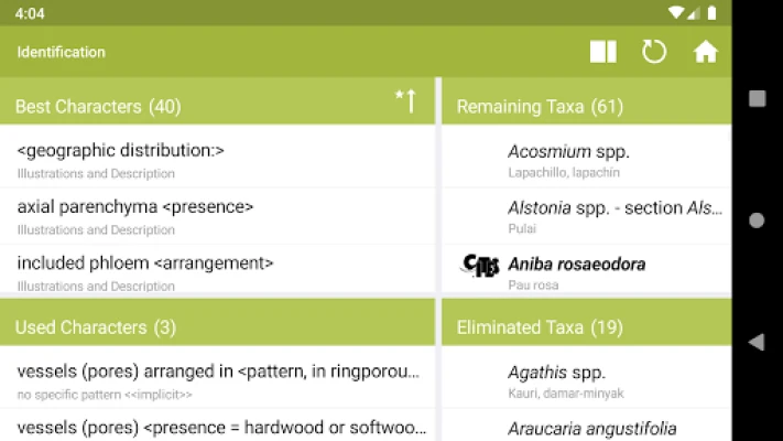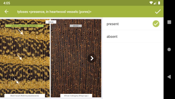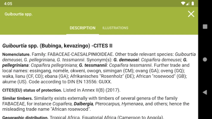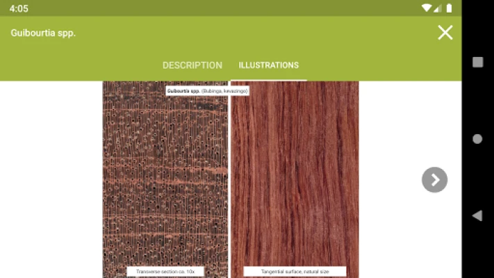 • interactive identification of the most important CITES-protected timbers (hardwoods and softwoods) based on macroscopic features to be observed with the unaided eye or with a hand lens