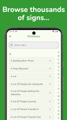 In this app, you can: - Browse the dictionary: Learn thousands of signs from a diverse group of signers - Choose a category: Explore sign categories covering a variety of topics - Reinforce your learning: Review categories with multiple choice games - Play with our Fingerspelling Game: Strengthen your fingerspelling skills with our randomized fingerspelling word generator