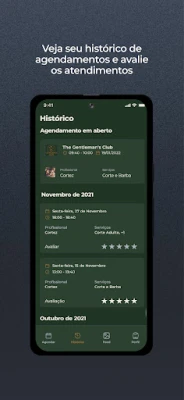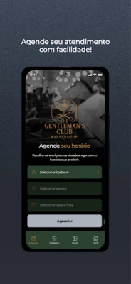 Através do App The Gentleman's Club os clientes podem realizar seus agendamentos de uma forma muito mais prática. Na tela inicial, é possível selecionar os serviços e horário desejado para seu próximo atendimento. Já na tela de histórico, você poderá confirmar ou cancelar seus agendamentos. É possível também na tela do perfil o cliente editar suas informações, como e-mail, foto de perfil e telefone.